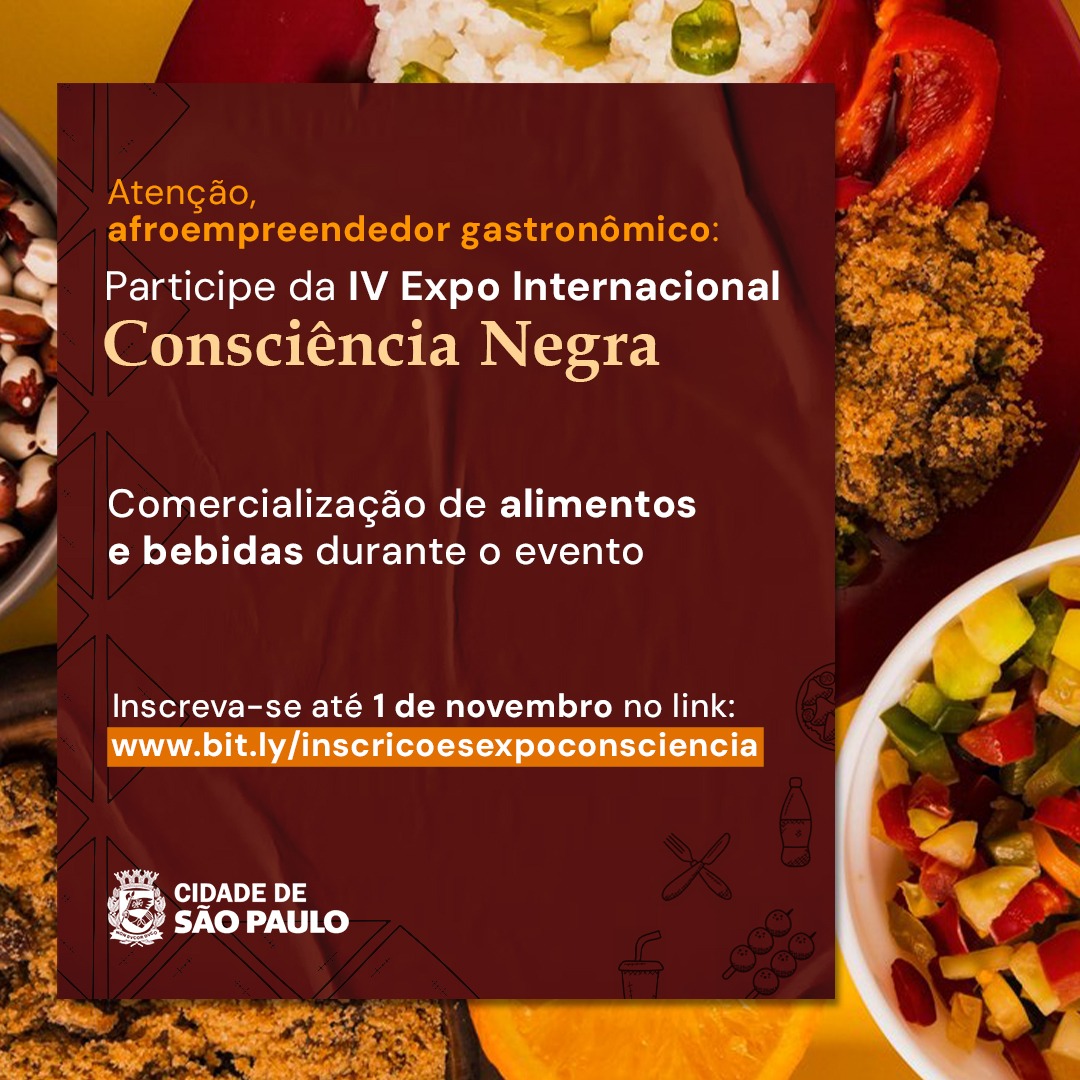 A Secretaria Municipal de Desenvolvimento Econômico e Trabalho anuncia a abertura das inscrições para afroempreendedores do setor gastronômico interessados em comercializar seus produtos e bebidas na IV Expo Internacional da Consciência Negra, que será realizada entre os dias 22 e 24 de novembro, no Pavilhão de Exposições dos Distritos Anhembi. A iniciativa conta com o apoio do Observatório da Gastronomia, que será responsável pela seleção dos participantes. Os interessados devem ser credenciados no programa SP Afroempreendedor. As inscrições estarão abertas até 1º de novembro e podem ser feitas por meio deste link: www.bit.ly/inscricaoexpoconsciencianegra
